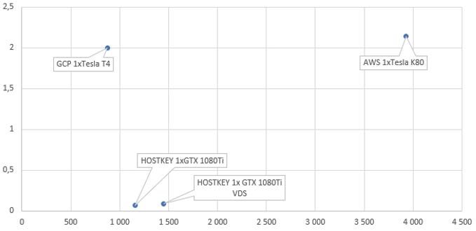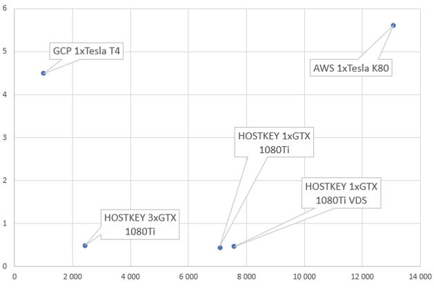 A team of experts from the Catalyst project conducted a comparative test of the cost and speed of training a model using the NVIDIA GPU on servers from the following providers: HOSTKEY (from one to three GeForce GTX 1080 Ti GPUs + Xeon E3), Google (Tesla T4) and AWS (Tesla K80). The tests used the standard ResNet architecture for these kinds computer vision tasks, which determined the names of artists from their paintings.