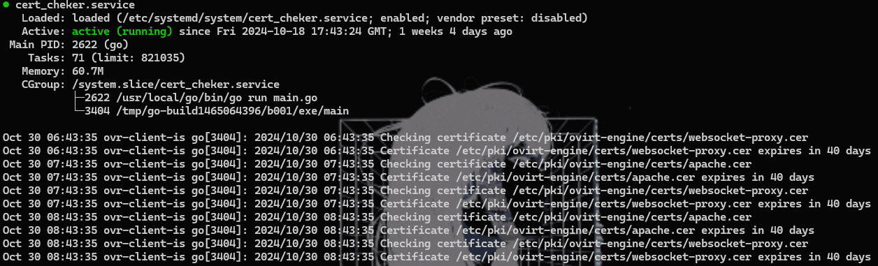 To address this issue, we developed a specialized exporter called cert_checker, which is installed directly on each oVirt Engine in the /opt/certchecker directory. For those who may not be familiar with it, oVirt Engine is a central management server that oversees all virtualization nodes, shared disk resources, and virtual networks.