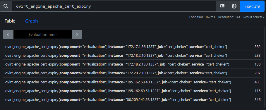After the successful update, we should navigate to the URL (http://<ip>:9090/) and test the target by entering the name of the attribute we’re looking for, such as ovirt_engine_apache_certexpiry. If there are no issues, the output should look similar to this: