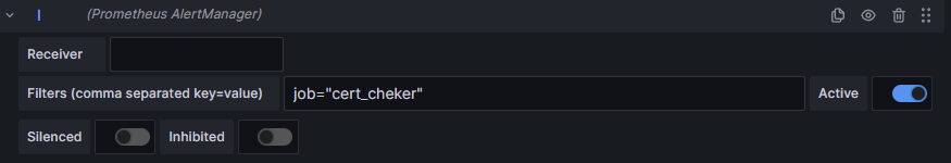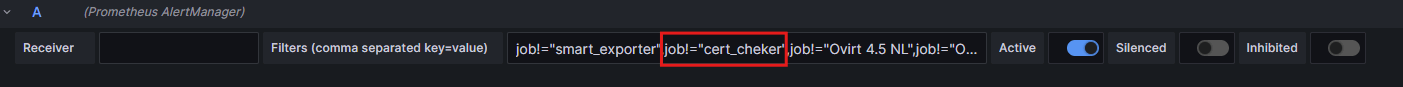 We need to enter the alert name in the format job!="cert_cheker". Make sure to include a comma after it. If the name is entered in the middle of the field, place commas on both sides of it.