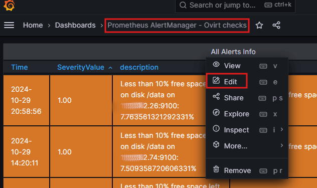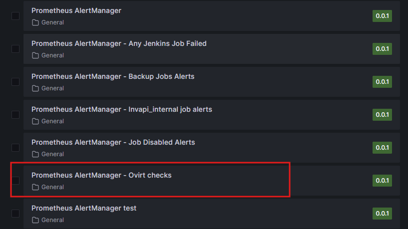 Next, we proceed to the Prometheus AlertManager dashboard – specifically, the Ovirt Checks section: