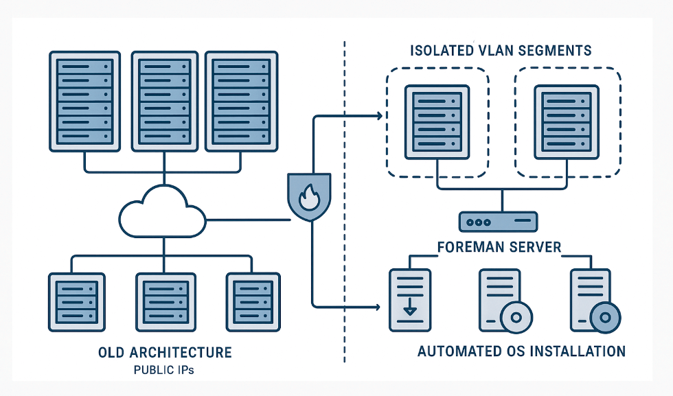 Migrating to an isolated network architecture for Foreman marked a pivotal step in the evolution of our automation infrastructure. Transitioning from public IP addresses to fully private networks with multi-layered security significantly enhanced system security, cutting the risk of unauthorized external access.