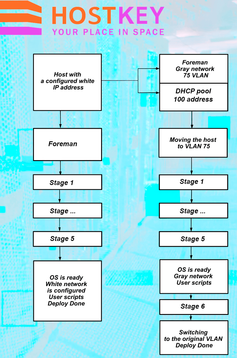 The Installation Process Now Works as Follows: when a configuration is created on Foreman, the server automatically switches to a private VLAN, where the entire installation process takes place. After the operating system installation is complete, a script from the OS itself sends a request to Invapi to switch the server back to a public VLAN. Before sending this request, the script modifies the network settings to use public parameters — this can be either DHCP or a static configuration, which is directly managed on Foreman based on the client’s specific requirements: