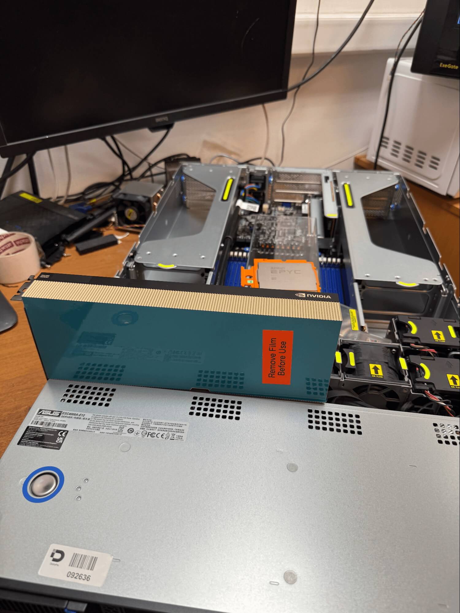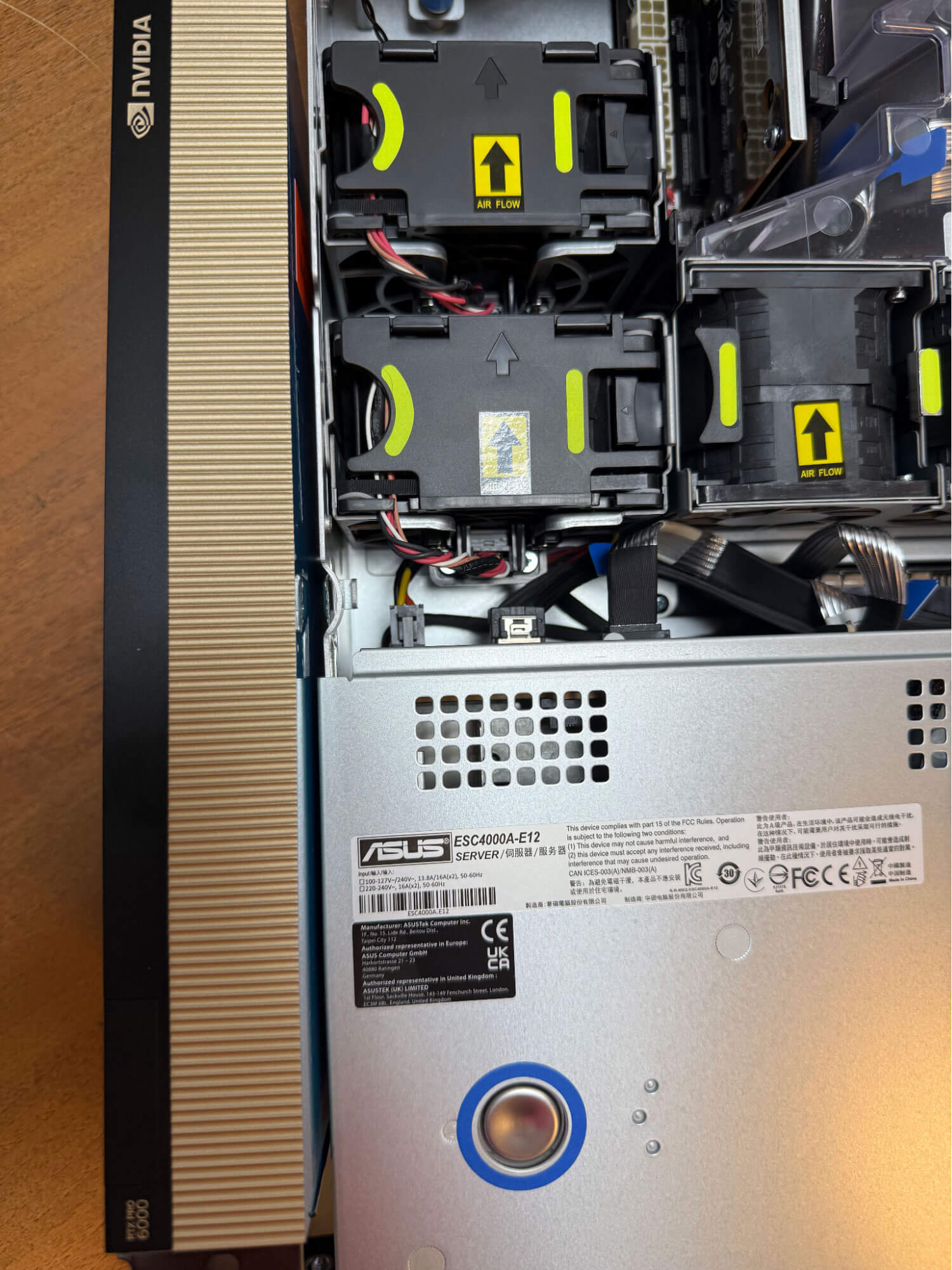 Technically, the platform supports up to 4 GPUs, but due to power consumption limitations in the no-power-restriction mode, a maximum of two RTX 6000 PRO SERVER GPUs can be installed. The issue arises because the platform provides 4 power connectors per side, which are connected to the card via an adapter. As shown in the photo, the case is equipped with powerful fans on both sides and a specialized housing, ensuring excellent airflow over the radiators and GPU components.