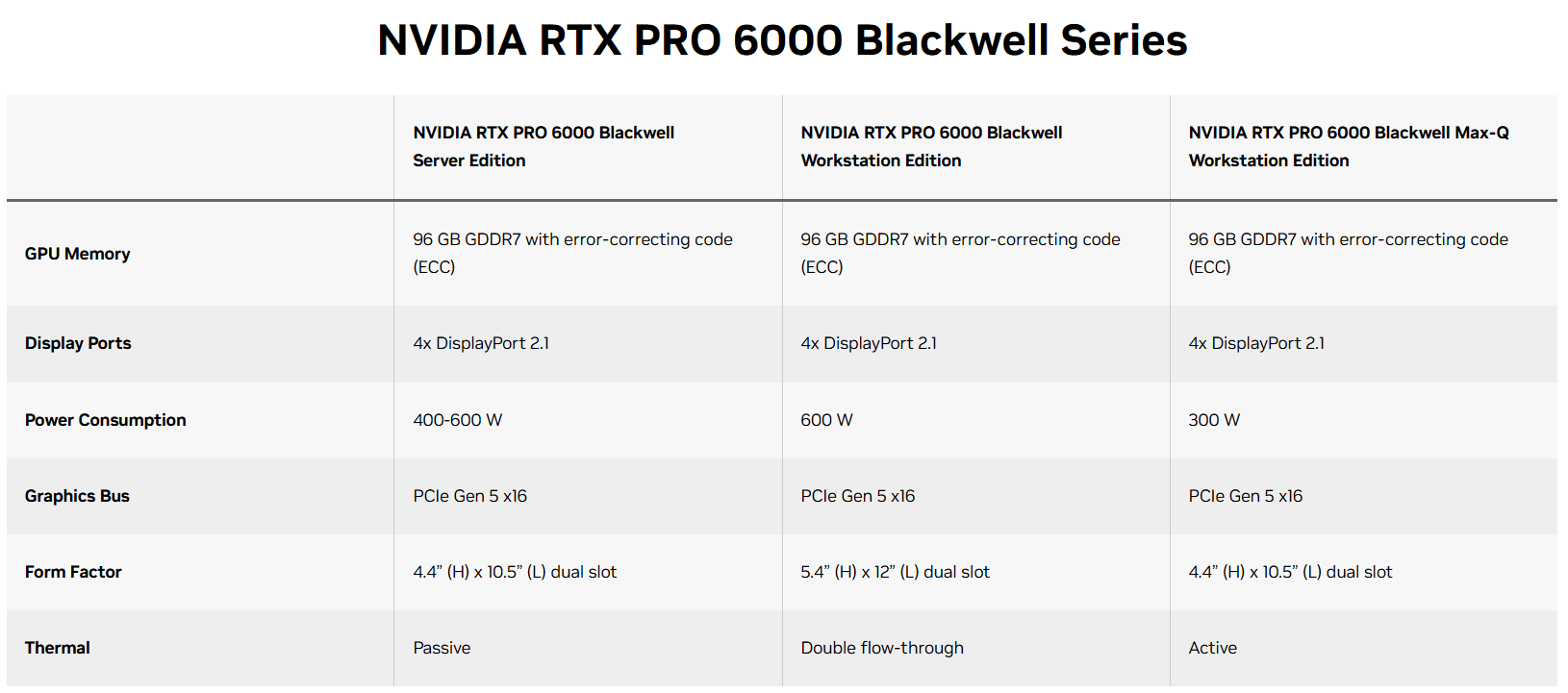 | GPU Memory | 96 GB GDDR7 with ECC | 96 GB GDDR7 with ECC | 96 GB GDDR7 with ECC | 32 GB GDDR7 |