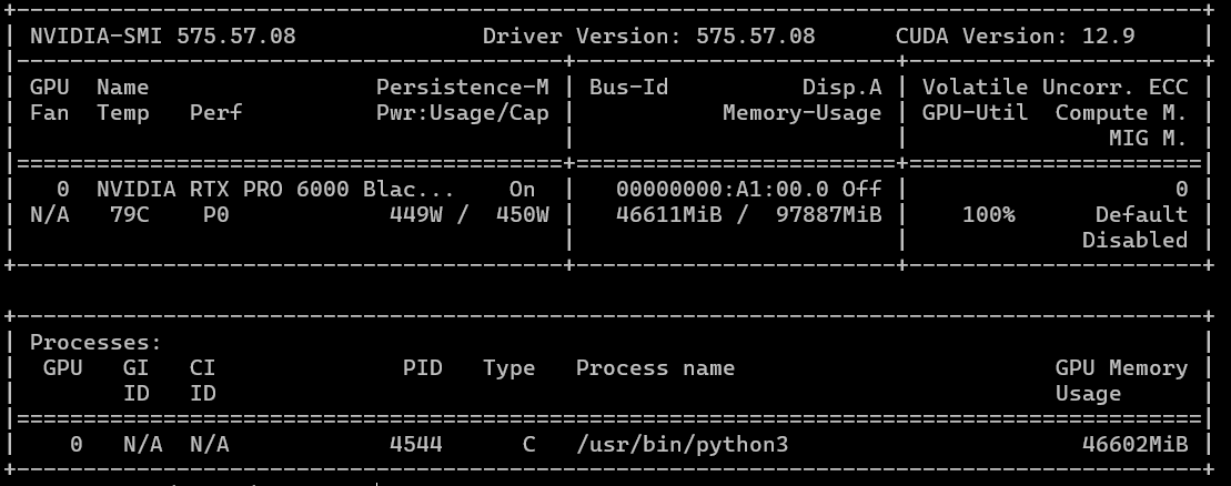 To start, we'll compare the previous generation A5000 with the RTX 6000 PRO. The comparison will be conducted in low power consumption mode, where the GPU actually consumes up to 450W (boost mode), rather than the 300W maximum stated in the documentation. Recall that the A5000 features 24 GB of GDDR6 VRAM.