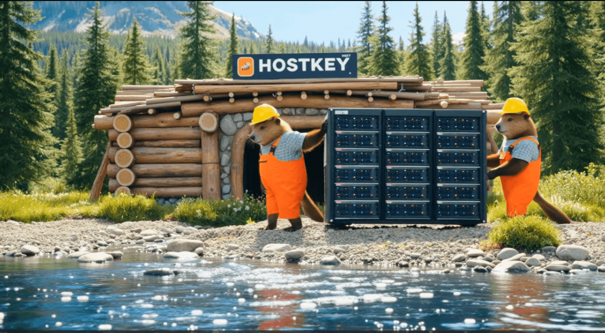A whimsical and humorous scene unfolds on a serene riverbank, where two hardworking beavers in bright yellow safety helmets and rugged orange overalls team up to haul a massive, gleaming server rack toward their meticulously built beaver lodge. The lodge, constructed from logs and stones, features a bold, modern sign reading "HOSTKEY" in bold, tech-inspired typography. The beavers’ determined expressions and the server rack’s glowing lights create a surreal blend of nature and technology. The river sparkles in the sunlight, and the lodge’s entrance is framed by lush greenery, emphasizing the harmony between the beavers’ natural habitat and their unexpected tech-savvy mission. The scene is vibrant, detailed, and filled with playful energy, blending the charm of wildlife with the precision of data infrastructure. Perfect for a lighthearted, tech-themed animation or meme.
