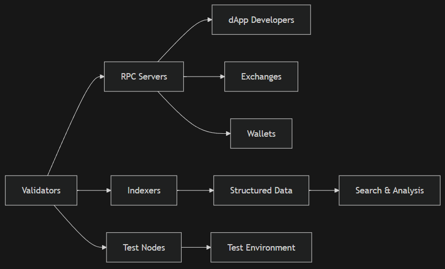 - RPC Servers (Remote Procedure Call nodes) — Provide API for interacting with the network, used by dApp developers, exchanges, and wallets.