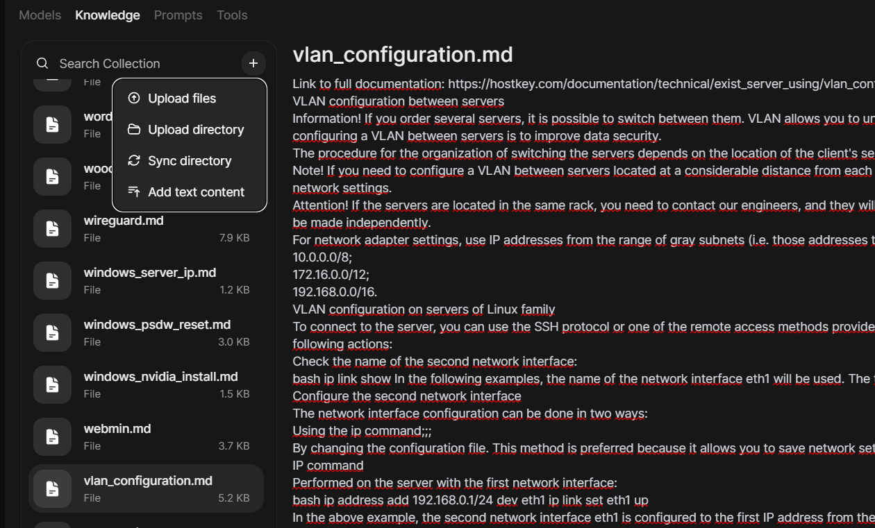 Recent updates made viewing and adding documents significantly more convenient. You can now add documents from entire directories, and synchronize changes between your local directory with files and those in the knowledge base (previously you had to delete files and re-upload them). There's also a built-in editor for adding text directly to the knowledge base.
