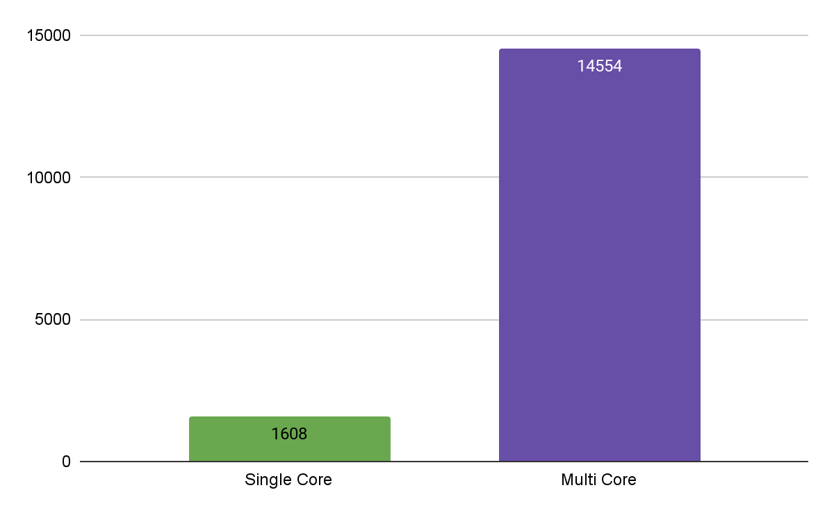 In the single core performance test, a result of 1608 points was obtained. This indicates a fairly high speed of execution of sequential tasks on a single core.