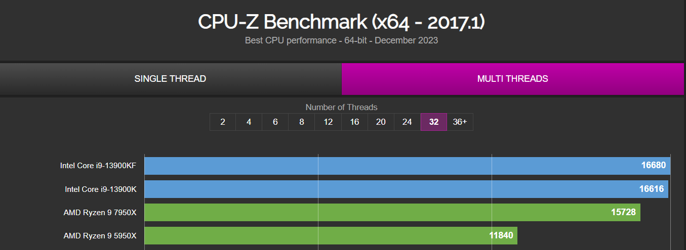If we look at the official corporate results, our findings were quite close to the optimal ones obtained by the authors of CPU-Z (the i9-13900KF processor is weaker than the 14900KF by 5-10 per cent), but close to the real ones. In turn, the "test" advantage of the 14900KF over the Ryzen 9 7950X in real life is insignificant.