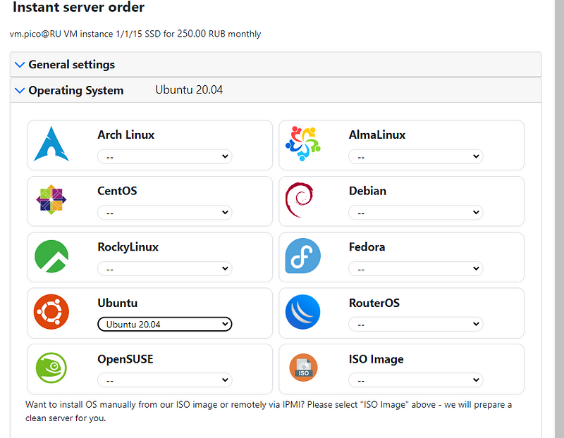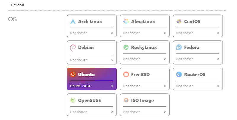 Below, select the operating system (in this case the only option is Ubuntu 20.04)