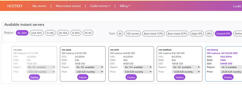 Go to the above address, log in, then select New instant servers in the top menu, and then select the region of the data center and the type of server.