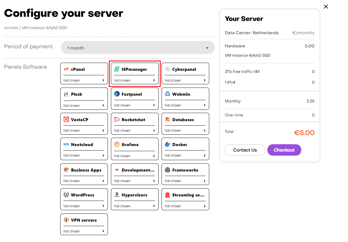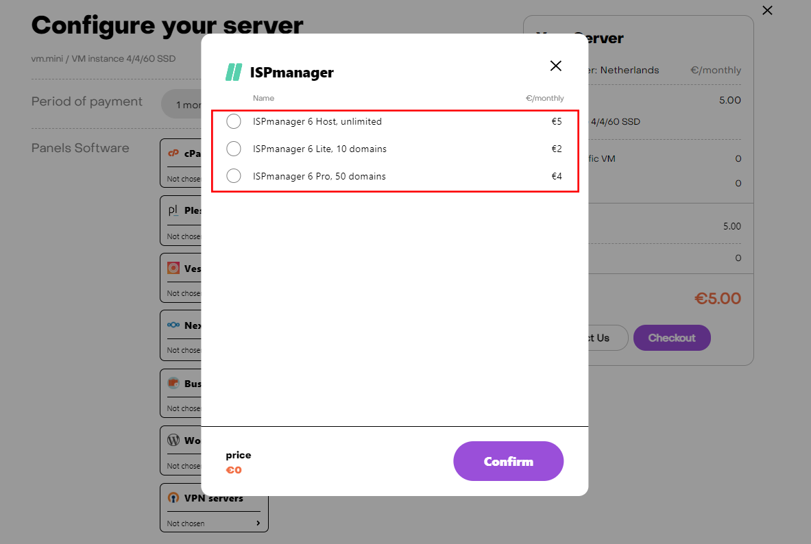 The following steps will describe how to configure a pre-installed ispmanager on a rented VPS. Detailed instructions on how to place an order on the hostkey.com website can be found here. When ordering a server, you must select ispmanager: