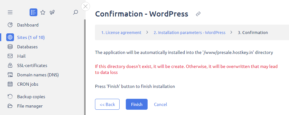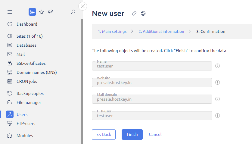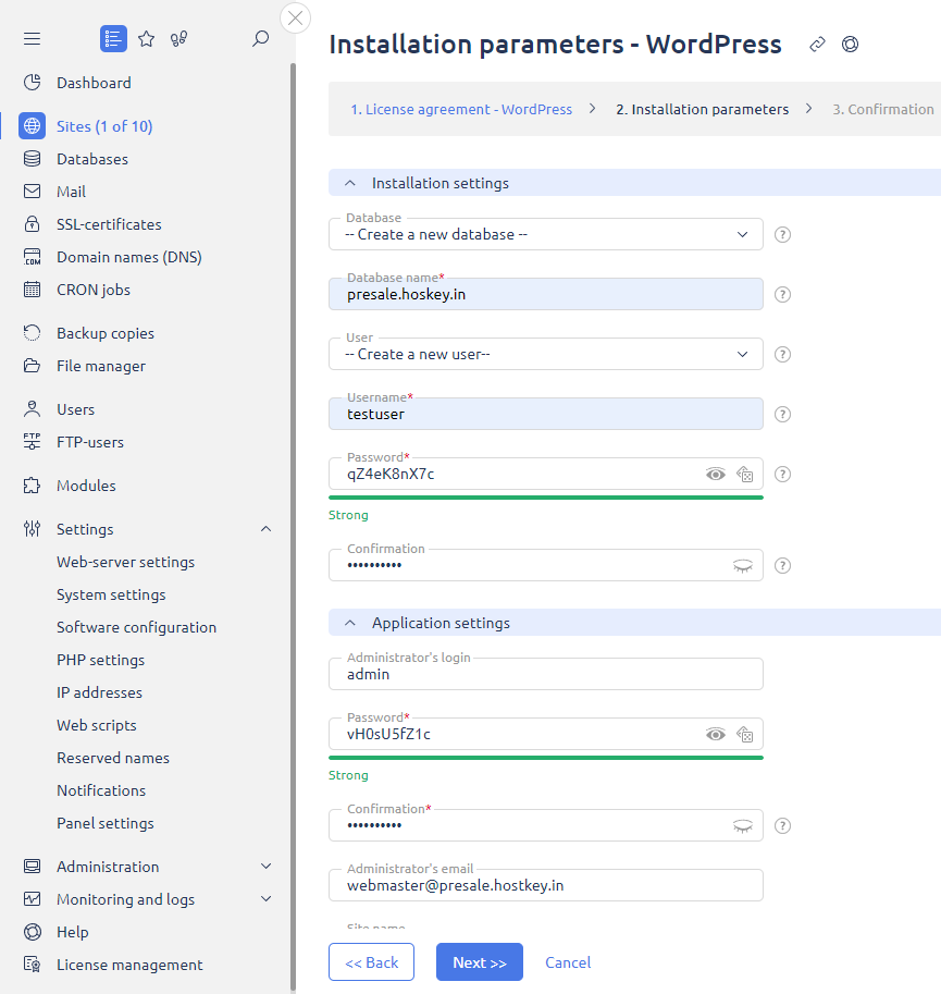 4. Fill in the data for automatic creation of the site and mail domains (optional):