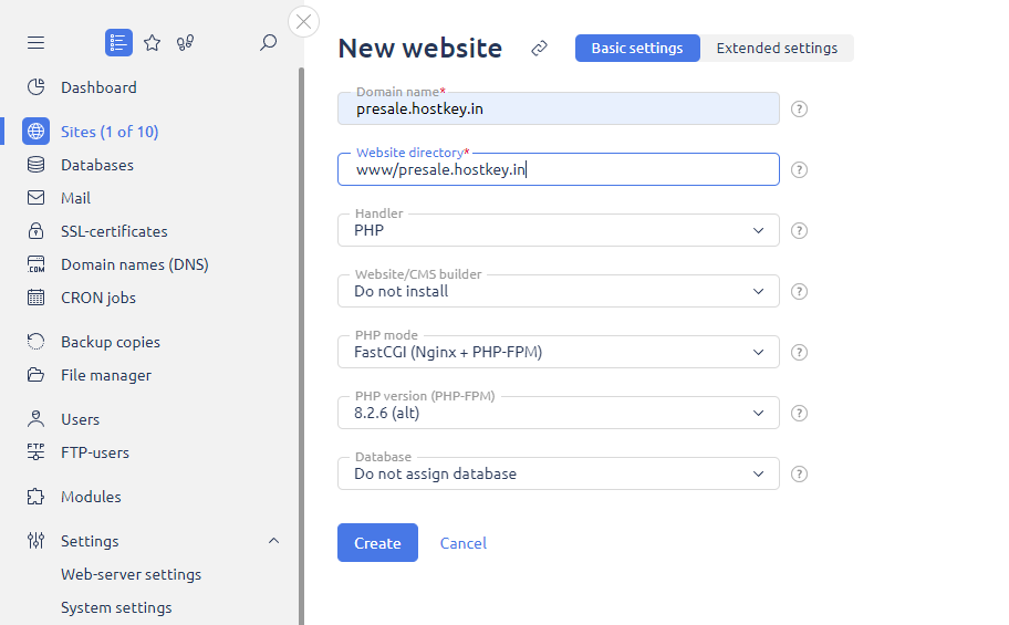 During the same stage, the necessary settings for the web server are made: you should choose the PHP-version and PHP mode, CMS and other parameters according to the requirements of your project.