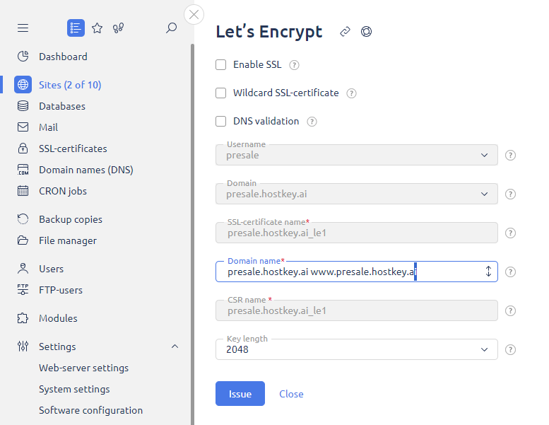4. Here you can also issue an SSL certificate for the site. If a certificate is not required, it is better to click the "Cancel" button. If you click on the "Cross" icon, a certificate will be issued.