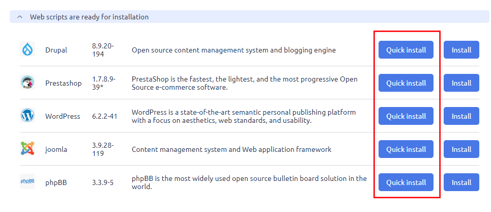After selecting the CMS, all you need to do is click on the "Quick Install" button. Then read the license agreement and accept it: