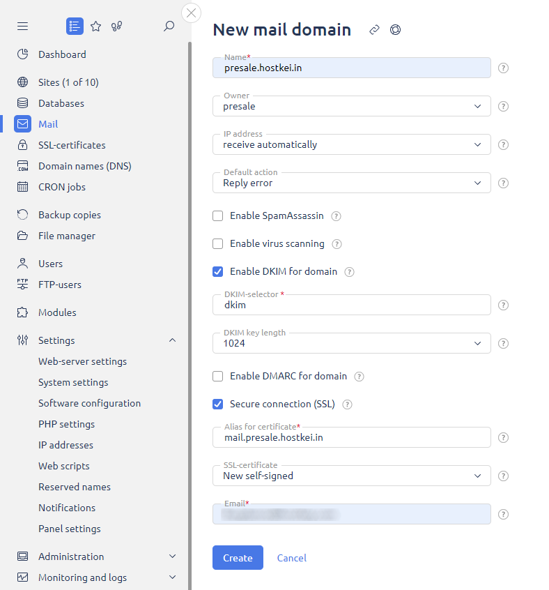 After filling in the fields, you should click on the "Create" button. Now you can start creating a mailbox. If you do not allow the DKIM option, your mail will likely attract spam.