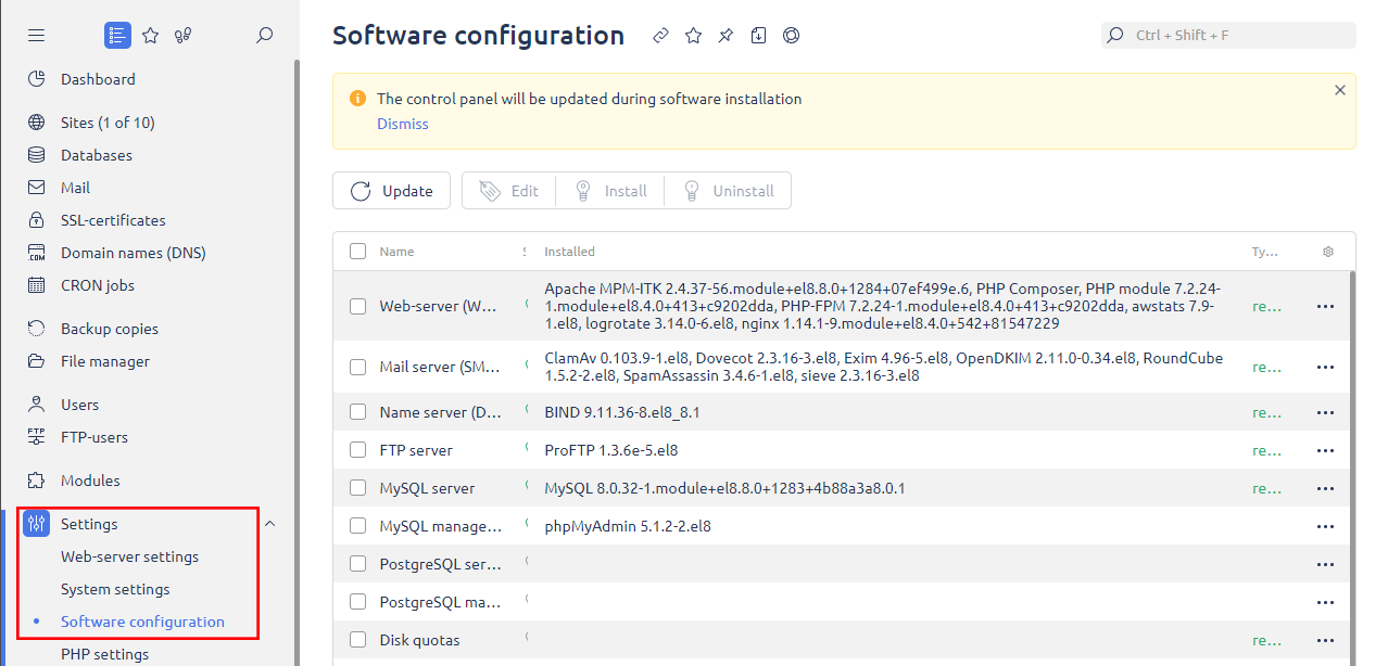 Before working with your site, you need to install the software you plan to use for your work. You can do this by going to "Settings" → "Software Configuration":
