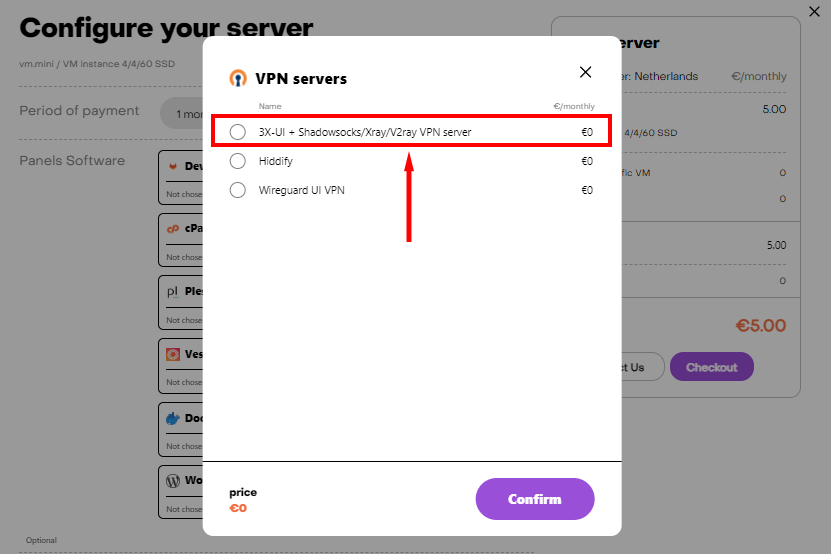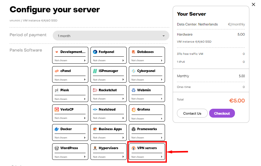 The following steps will describe how to configure the 3X-UI panel on a leased VPS. You can find detailed instructions on how to place an order on the hostkey.com website here. When ordering a server, you need to select VPN servers: