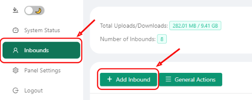 1. After authorization in the 3X-UI panel, go to the Inbounds tab and click the Add Inbound button: