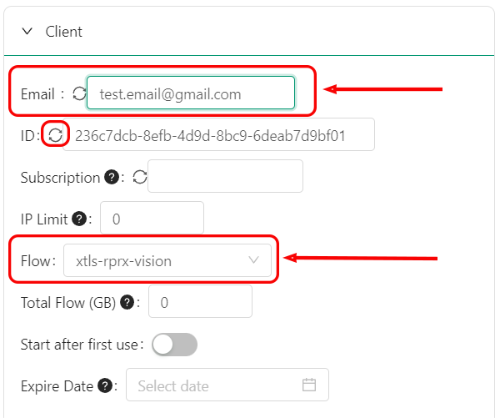 - ID (UUID) is a unique identifier for an incoming connection. The ID must be 32 characters long and can only contain numbers and lowercase letters in the Latin alphabet. It can be generated automatically using the button before the key entry field.