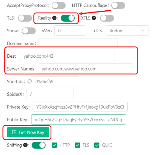 8. In the Dest and Server Names fields, enter the domain for masking. It is necessary to use a domain that is not blocked in the jurisdiction that you will connect from. It is better to change the default yahoo.com. For example, www.microsoft.com:443, dl.google.com:443, www.samsung.com:443, www.googletagmanager.com:443, etc.