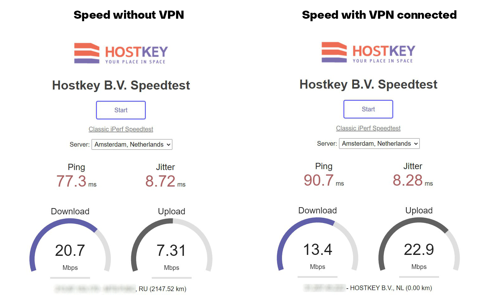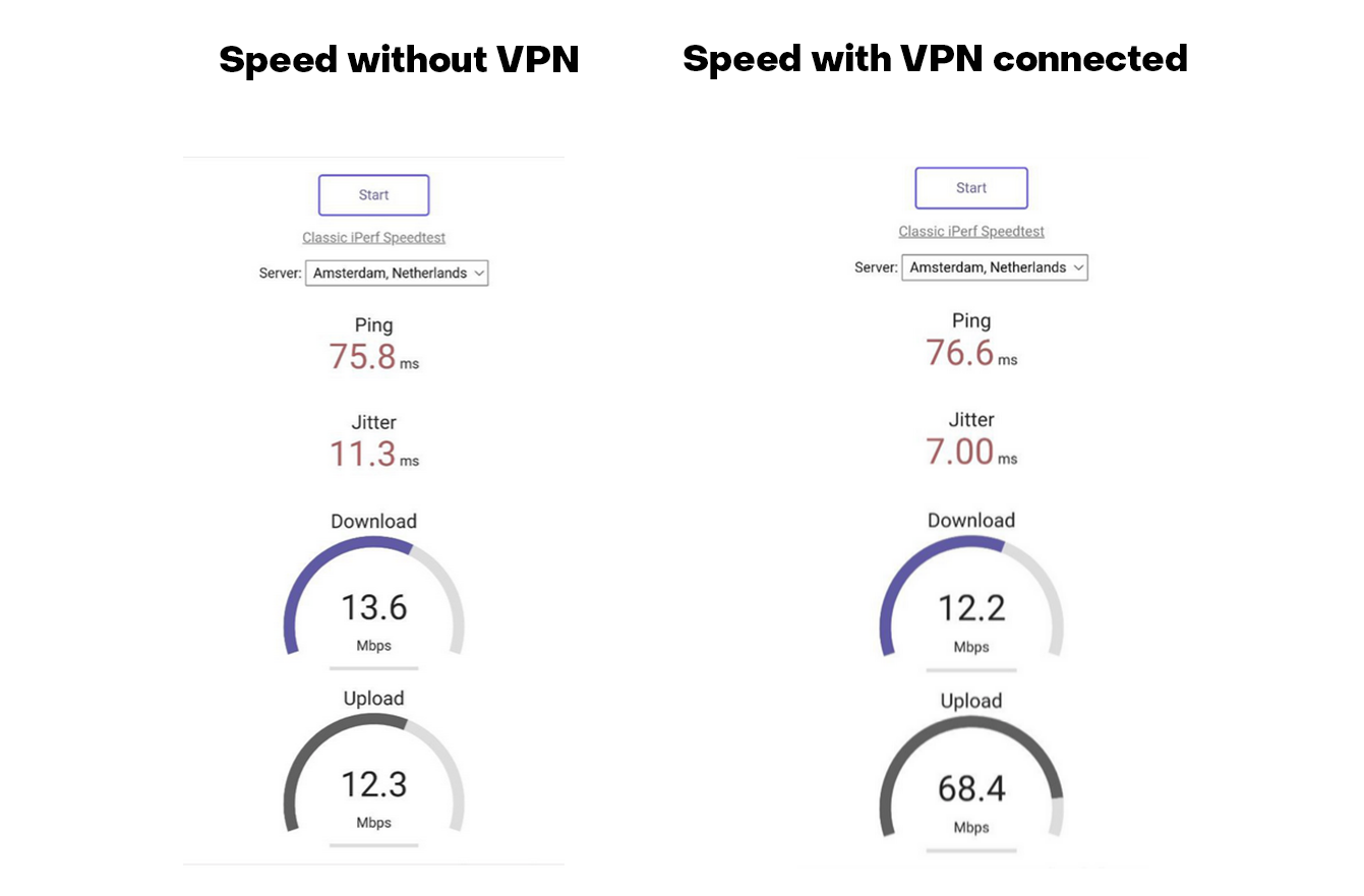 Checking your internet speed when using a VPN is important because the VPN connection by necessity reduces the speed as a consequence of the additional load on the VPN server and the time spent on data encryption. To compare the Internet speeds, we use our standard company speed test.
