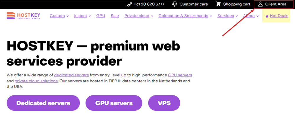 To order a server, you need to register on our website hostkey.com. Go to the main page and click on "My Account" in the upper right corner.