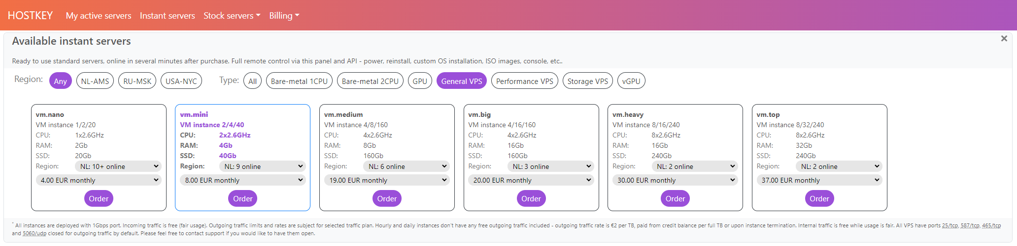 Select the vm.nano server configuration for the desired location (NL-AMS — Netherlands, Amsterdam; USA-NYC — USA, New York; RU-MSC — Russia, Moscow), and then click the Order button. When paying up front for 3, 6 or 12 months, you will receive a discount.