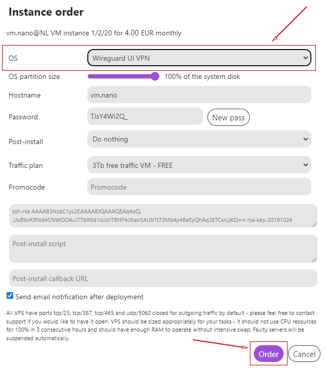 When configuring the server settings, select WireGuard VPN from the list of operating systems and click the Order button: