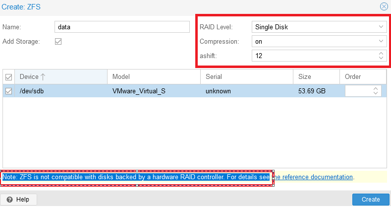It is important to understand this message: “Note: ZFS is not compatible with disks backed by a hardware RAID controller”. According to this recommendation (a link to the documentation will be displayed on the screen), disks for ZFS should be presented to the system by-passing the hardware RAID controller.