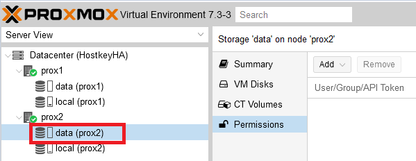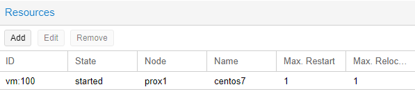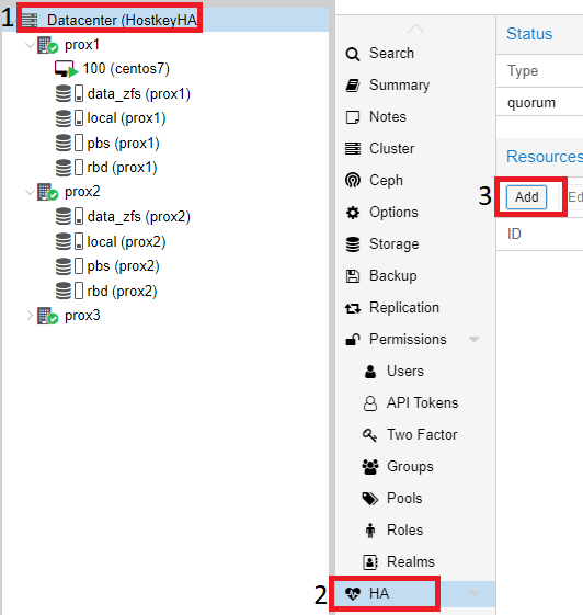 To enable the “HA” mode (High Availability, virtual server migration) on virtual servers, you need to click on “Datacenter”, select the “HA” item on the right side and click on the “Add” button: