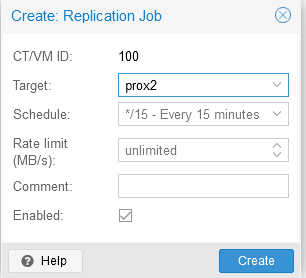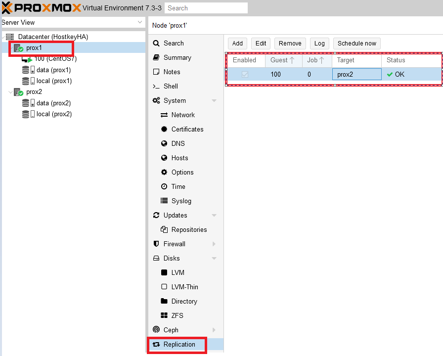 After building a cluster of three servers, you can configure replication to 2 servers. Thus, three physical servers will participate in the migration. In our case, replication is configured for the prox2, prox3 servers: