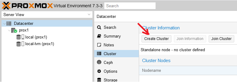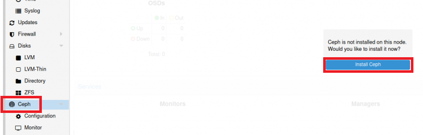 It is very easy to find a lot of materials on installing Ceph on Proxmox on the Internet, so we will briefly describe only the installation steps. To install Ceph, you need to select one of the physical servers, select the “Ceph” section and click on the “Install Ceph” button: