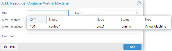 In the newly opened window in the "VM" drop-down list, select all the servers on which you want to enable "HA" and click on the "Add" button: