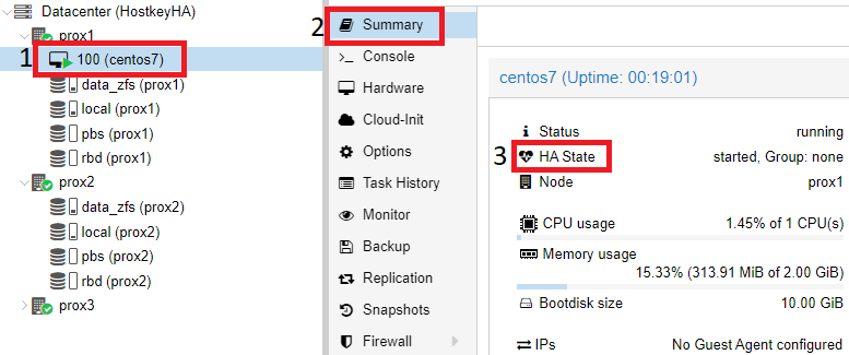 We can also check that the “HA” mode is enabled on the virtual server itself, for this you need to click on the desired virtual server (in our case, CentOS7) and select the “Summary” section on the right side.