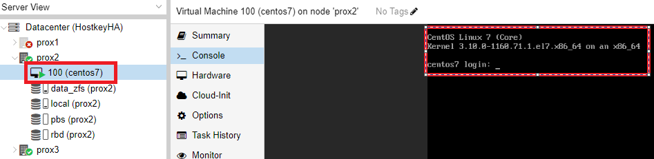 After the virtual server replication is correctly configured, we can test the operation of the cluster. In our case, we disabled all network ports on the physical server prox1. After some time (4 minutes in our case), the CentOS 7 virtual server switches over and can be accessed over the network.