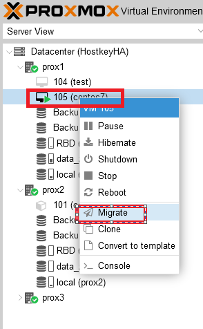To switch a virtual server from one physical server to another, select the target server and right-click on it. In the menu that opens, select the “Migrate” item: