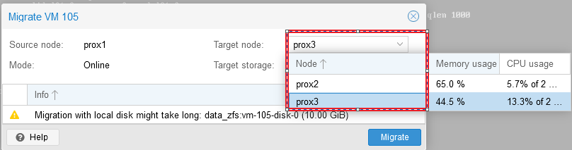 After clicking on the “Migrate” button, a window will open in which you can select the server to which we plan to migrate our virtual server, select the server and click “Migrate”: