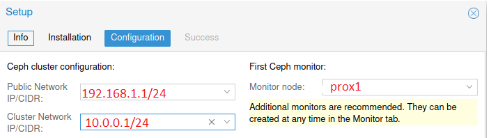 The Ceph version is listed by default. You must click the “Start nautilus installation” button. After installation, the system will ask you to specify the network settings. In our case, the configuration was carried out from the first server and its IP addresses are indicated as an example: