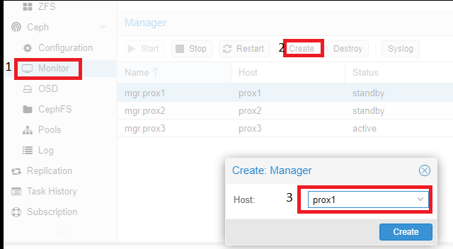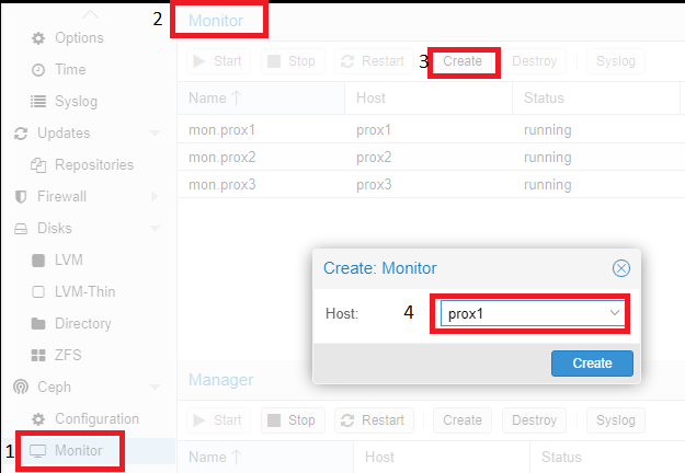 Then you need to add the servers playing the “Monitor” and “Manager” roles. To do this, click on the name of the physical server, go to the “Monitor” section, click on the “Create” item, and select the servers united in the cluster. Then, add them one by one: