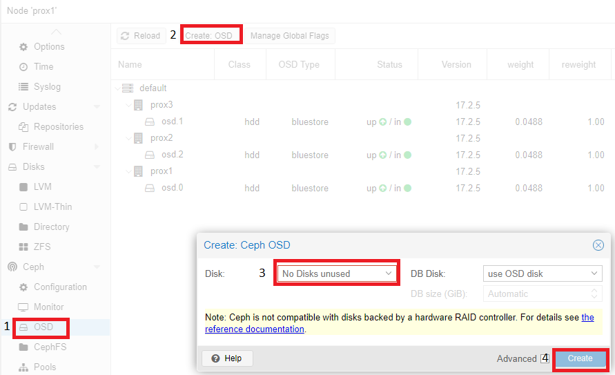 According to the recommendation (a link to the documentation will be displayed on the screen), disks should be presented to the system by-passing the hardware RAID controller. Using a hardware RAID controller can negatively affect the stability and performance of the Ceph implementation.