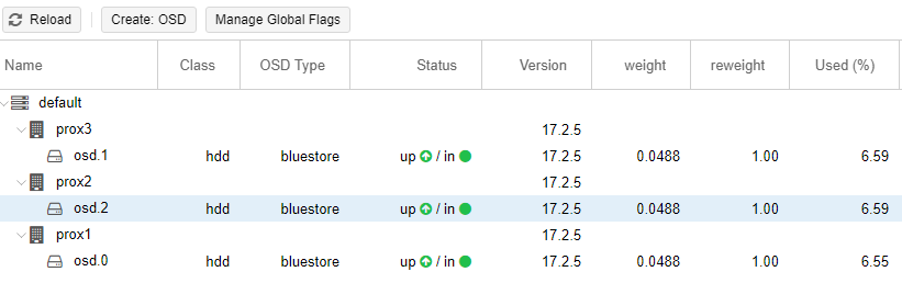 An example of a configured Ceph (on all three servers, the disk is /dev/sdc):