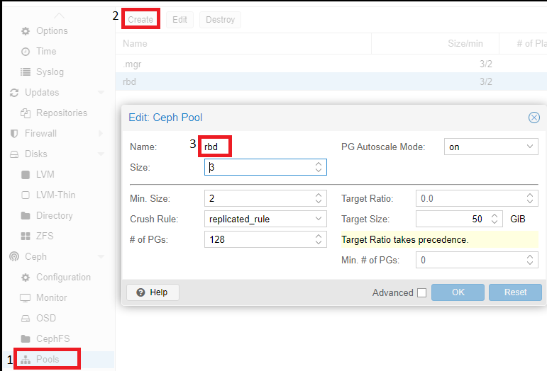 The last step in configuring Ceph is to create a pool, which will later be specified when creating virtual servers. To do this, click on the name of the physical server, go to the “Pools” section and apply the following settings: