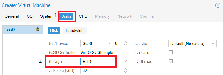 The Pool (rbd) we created above is used when creating the virtual machine. In the “Disks” section, it will contain our virtual server disks: