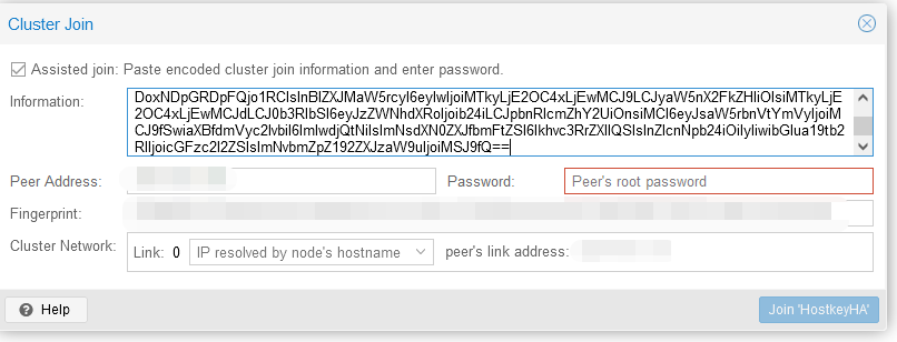 We first set the password (root) and the IP address of the server we are going to connect to, after which click on the button “Join-cluster name”: