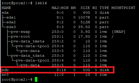 There are two disks installed on our server: the system is installed on the first one, the second one is designed to host virtual servers that will be replicated to a similar physical server. You need to go to the physical server via SSH and enter the lsblk command. The example below shows that we have an unpartitioned disk /sdb. We will use it to host servers and set up our replication: