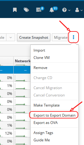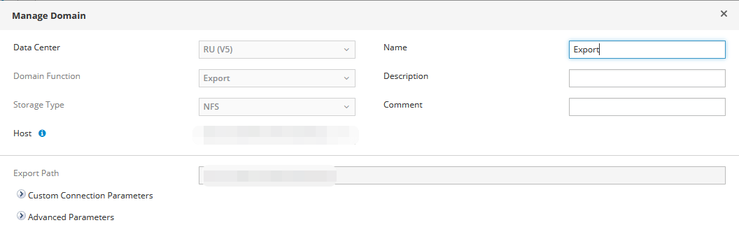 An Export Domain is a storage domain. There are a lot of resources on the Internet dedicated to the operation of Export Domains in oVirt. It is mainly used to move VMs to different datacenters or oVirt environments, and only when the VMs are backed up (this domain can exclusively use the NFS protocol). It is NFS-based and only one Export Domain can be added to the datacenter. To add an Export Domain to the infrastructure, you must first install the server and deploy the NFS service on it, as well as grant the necessary rights to the directory specified in the Export Path section in the settings.